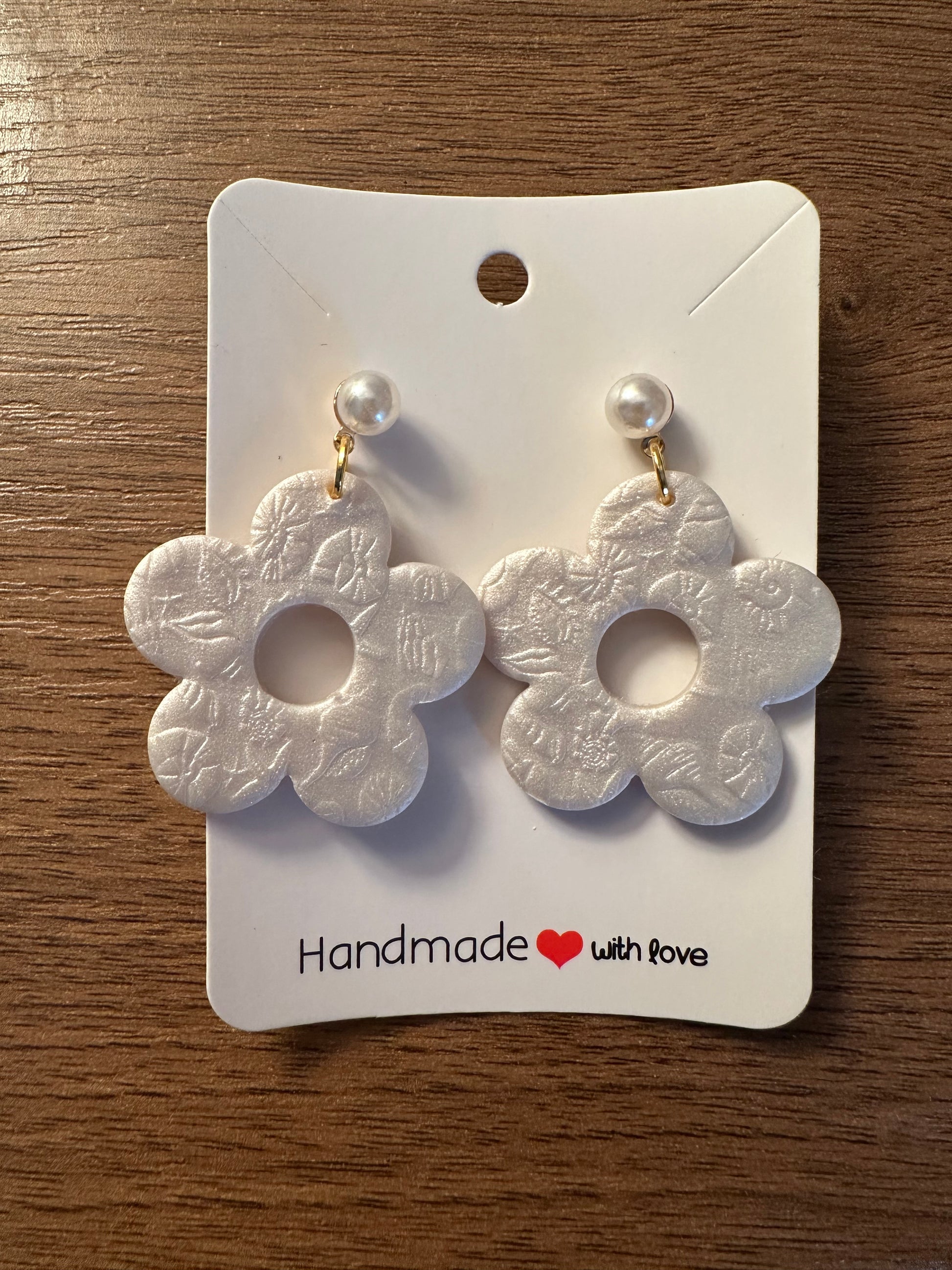 These Ocean Texture Pearl Flowers earrings. Crafted from polymer clay, each earring features delicate flower designs with a unique ocean-inspired texture and shimmering pearl accents.